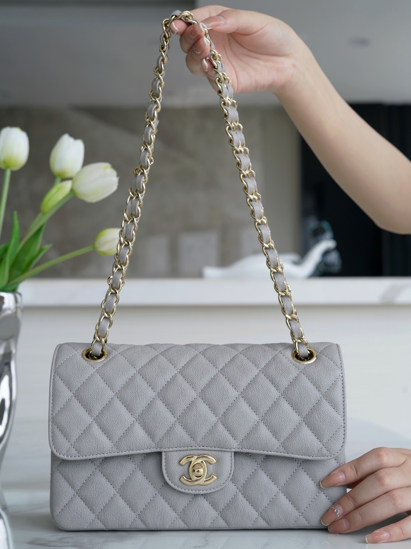 𝐂𝐇𝐀𝐍𝐄𝐋 Classic Flap France 🇫🇷 𝐇𝐚𝐚𝐬Original Caviar 🐂Water Fetal Calf Small 🐘Light Gray