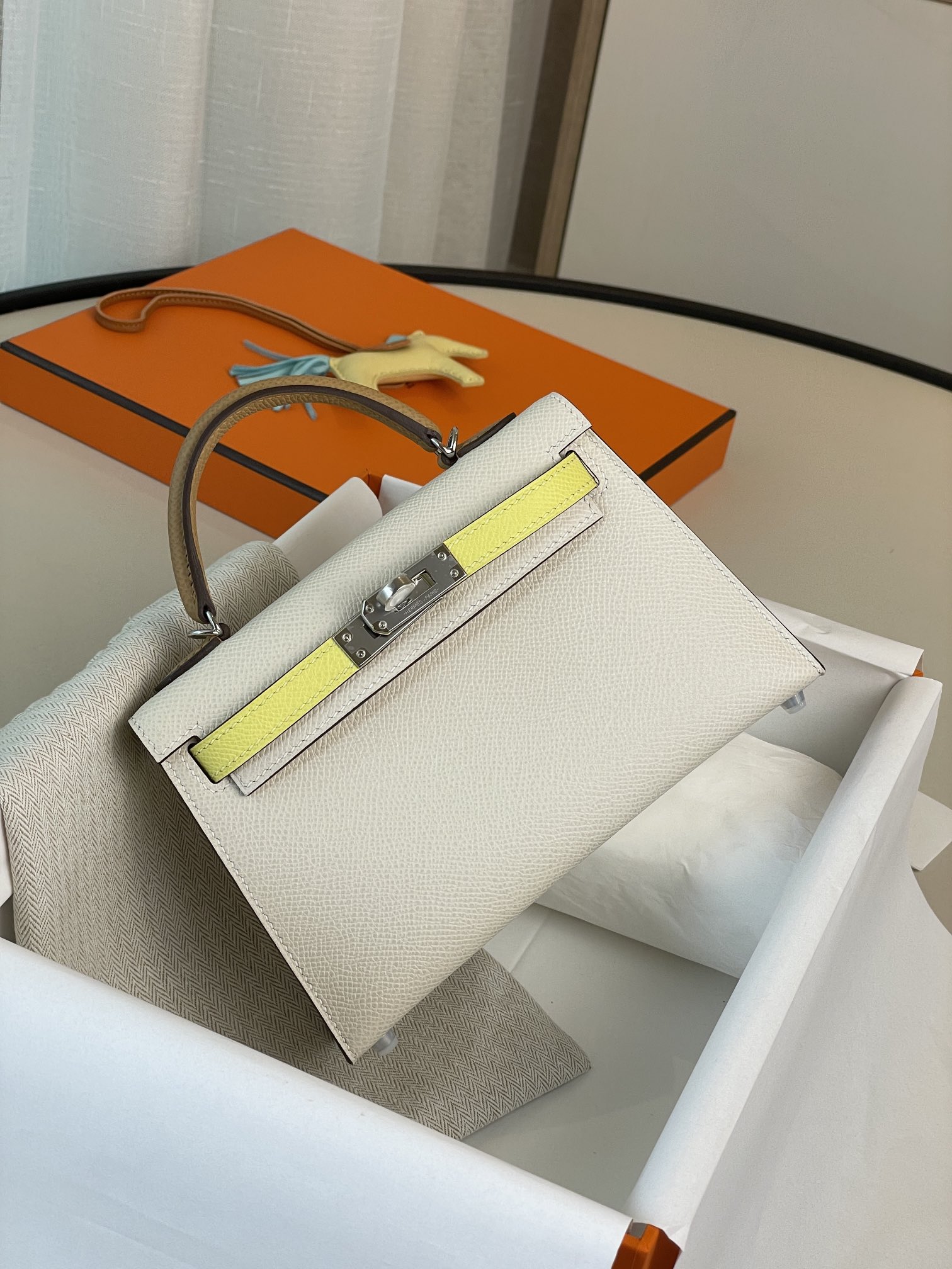 Mini Kelly second generation milkshake white gold buckle epsom leather